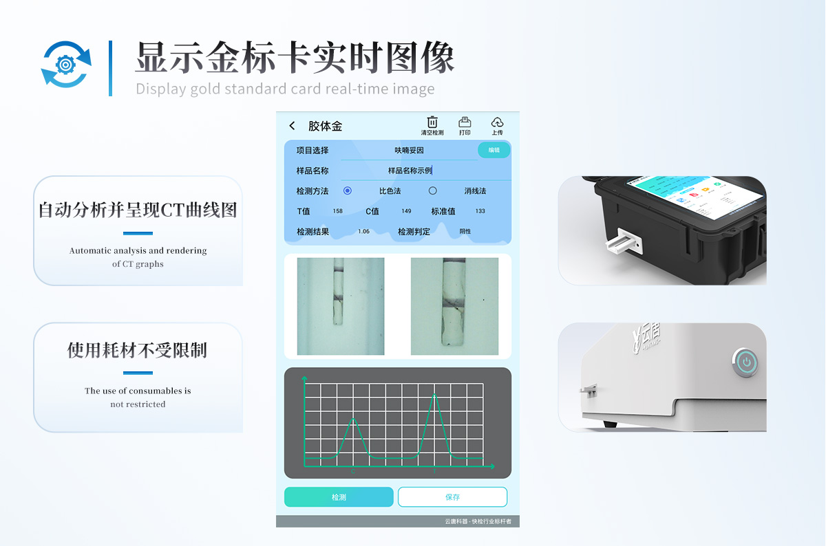 直插式自動掃描方式,可實時顯示金標卡實時圖像,系統自動分析并呈現出CT曲線圖,CT線自動識別,無需手動調整,完成檢測后自動退出檢測卡。